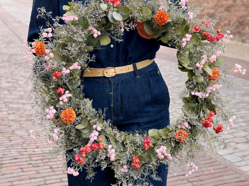 krans. De krans wordt gemaakt van natuurlijke materialen gecombineerd met zijden bloemen en is circa 45cm.